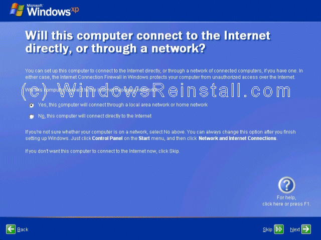 Internet connection option is next. If your computer connects to a home network or directly using the network card, or is on a network then select "Yes", otherwise select "No".