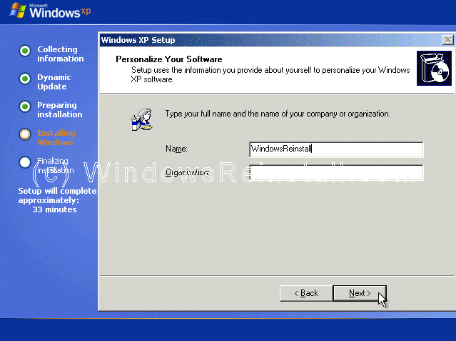 Now it is time to personalize Windows. File in your name and if you wish you can also file in the Organization section. Click "NEXT" when ready.