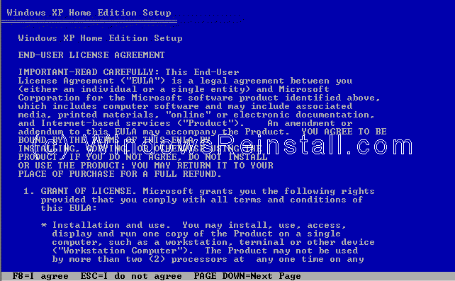 Windows XP License agreement, read, and if you agree press "F8" to continue, press "ESC" if you disagree. If you disagree setup will finish.