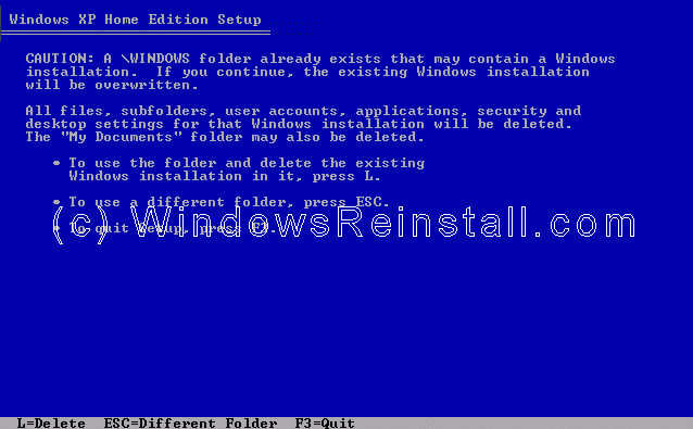 Windows will now warn you that the Windows directory already has an operating system, press "L" to select this folder and delete its contents.