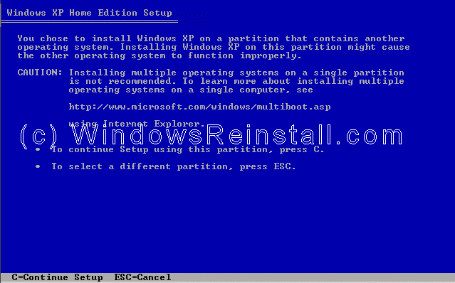 Windows will now ask you to confirm the install. If you are satisfied with your decision then press "C". You can return to the previous menu by pressing "ESC".