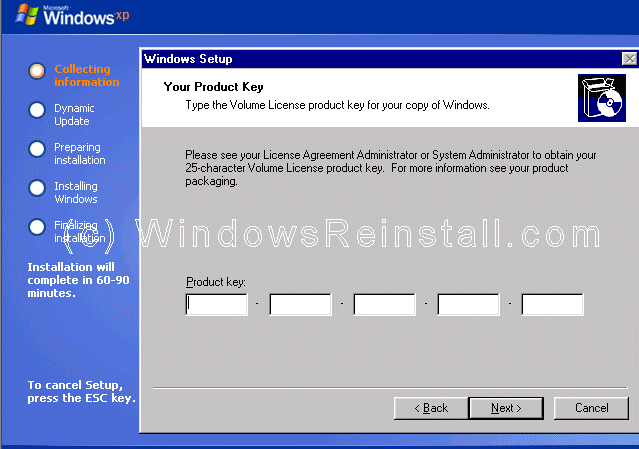 Now it is time for your product key. The product key will be on the packaging that XP was supplied with. It is 25 digits long. Some OEM computers will have a sticker on the side or back with your product key. Input the key and press "NEXT".